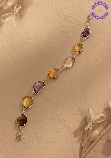 A stunning, chic design, this 925 sterling silver bracelet features natural gemstones such as Amethyst, Citrine, Green Amethyst and Smokey Topaz that gives it a luxe finish. A statement piece, this bracelet is perfect to add some pizazz to your everyday look. Match this with our Silver Multicoloured Stone Danglers to dress up any outfit.